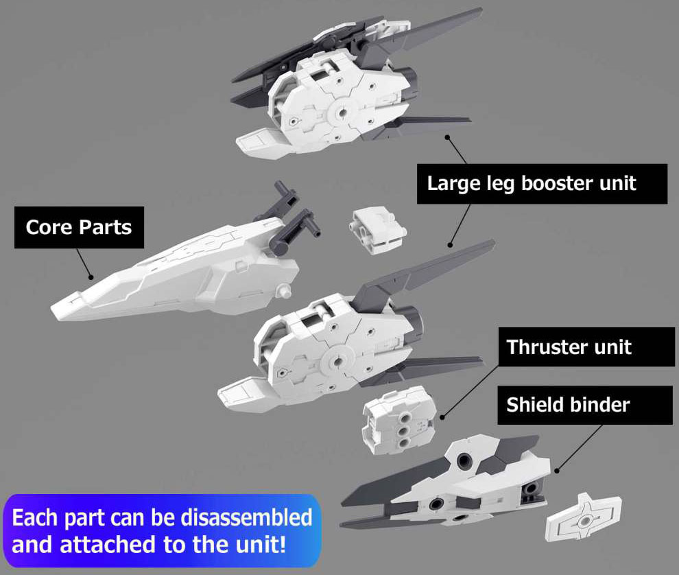 This large booster unit for your "30MM" (30Minutes Missions) items can be displayed by itself, or it can be attached to your figures as a customized part! Parts that make customization easy are included, such as shield binders, a large leg unit, and joints. Order yours now!