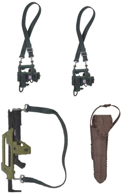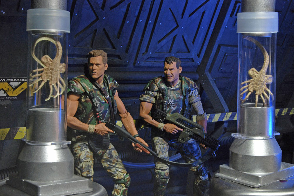Each figure stands approximately 18 cm tall and comes with an interchangeable head with a helmeted combat sculpt. The set comes packed with signature weapons and other accessories: pulse rifles, motion detectors, shoulder lamps, welding torches, shotgun and shotgun carrier. Both feature the authorized likeness of their actors (Bill Paxton and Michael Biehn) and have over 30 points of articulation for dramatic poses.