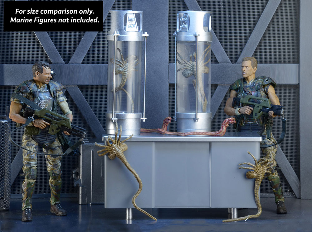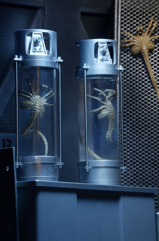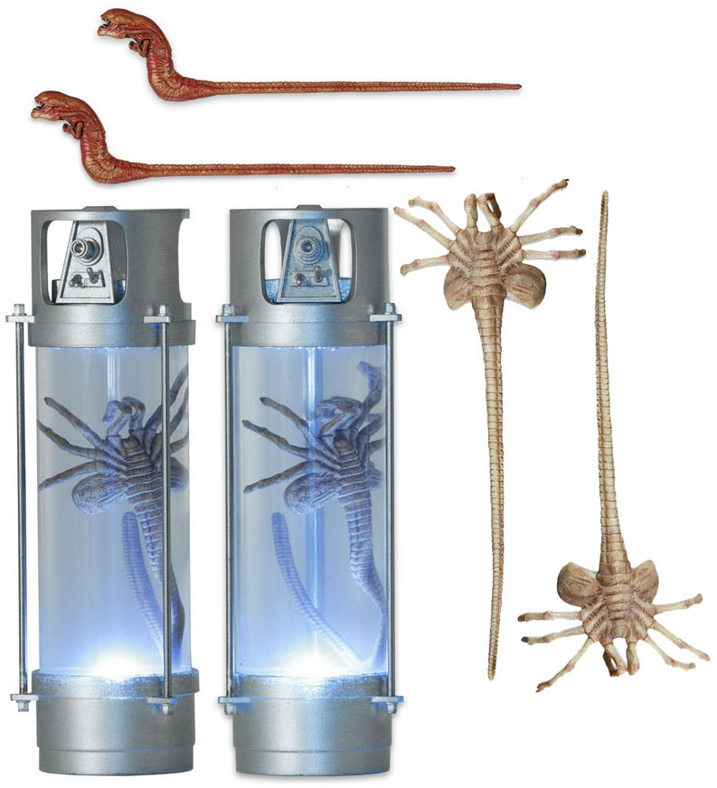 - 2x Stasis Chamber with LED Lights - Press a button to cast an eerie glow on the facehugger preserved within it! You can even fill the tube with water if you choose. Facehugger can also be removed from tube. Batteries included.