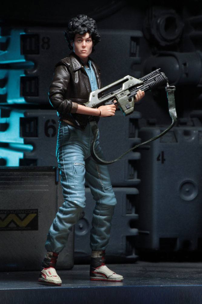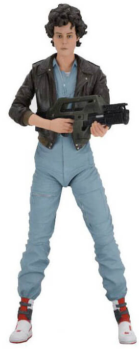 Ripley stands approximately 18 cm tall, has over 25 points of articulation and features the likeness of Sigourney Weaver. She wears a bomber jacket over blue coverall and comes with pulse rifle accessory and attachable muzzle flash.