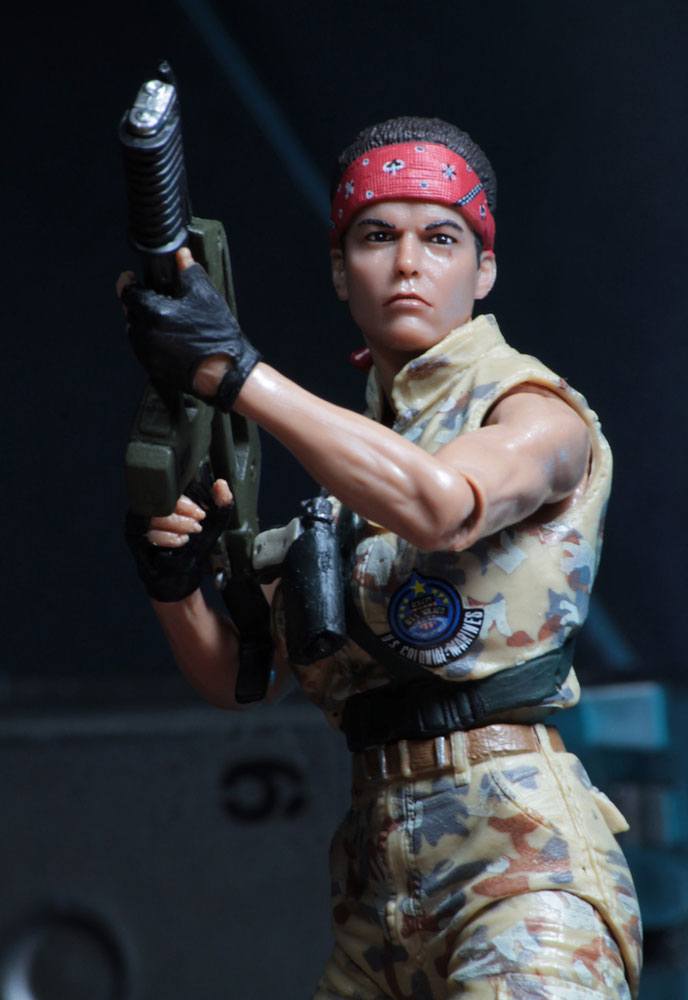 Vasquez stands approximately 17 cm tall and features the likeness of Jenette Goldstein. Vasquez is seen in her alternate outfit and the Marine gear is completely faithful to the movie, down to the "LOCO" detailing on the back of her vest. Vasquez has over 25 points of articulation and comes with pistol, knife and pulse rifle with attachable muzzle flash.