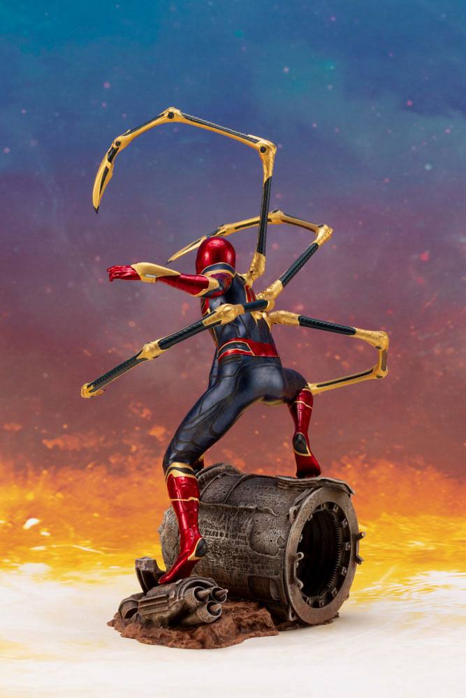 Peter Parker is decked out in the Iron Spider suit that fans first got a glimpse of in Homecoming and finally made its debut in Infinity War. In addition to the new sleek design, the suit's most noticeable feature are the metal pincers that extend from the hero's back, giving the statue an impressive size and height that rivals the Infinity War Thanos ARTFX+ statue.