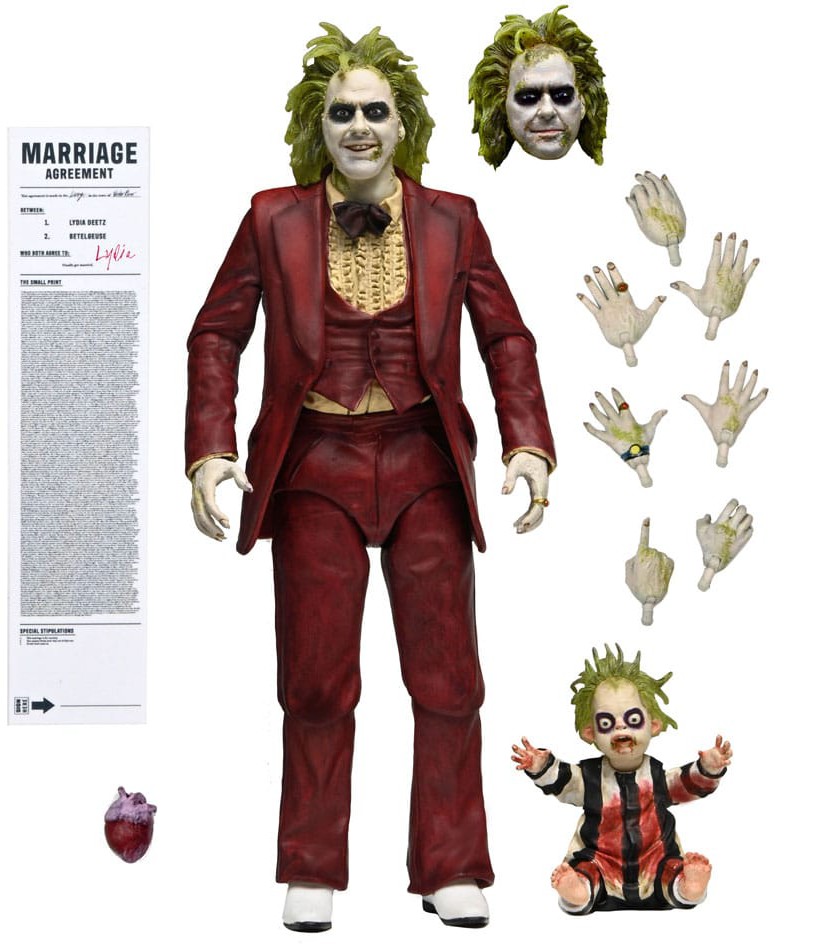 This 7-inch scale, fully articulated action figure includes interchangeable faceplates and hands, heart, bloody Baby Beetlejuice, and the marriage contract signed by Lydia. Comes in window-box packaging with opening front flap, perfect for your horror collection.