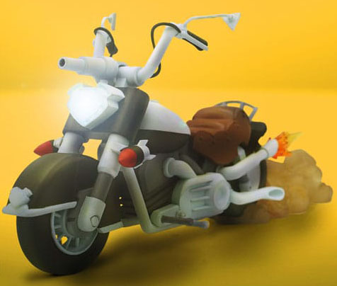 Saddled up and ready to lead, Throttle rides on the one and only Martian Monster Bike! With its ability to respond to Throttle's whistle, this trusty bike is never too far away and ensures that Throttle can always get into or out of any sticky situation he might find himself in. At almost 9 inches in length, Throttle's Martian Monster Bike will help keep you and the Biker Mice one step ahead of Limburger and his evil henchmen.