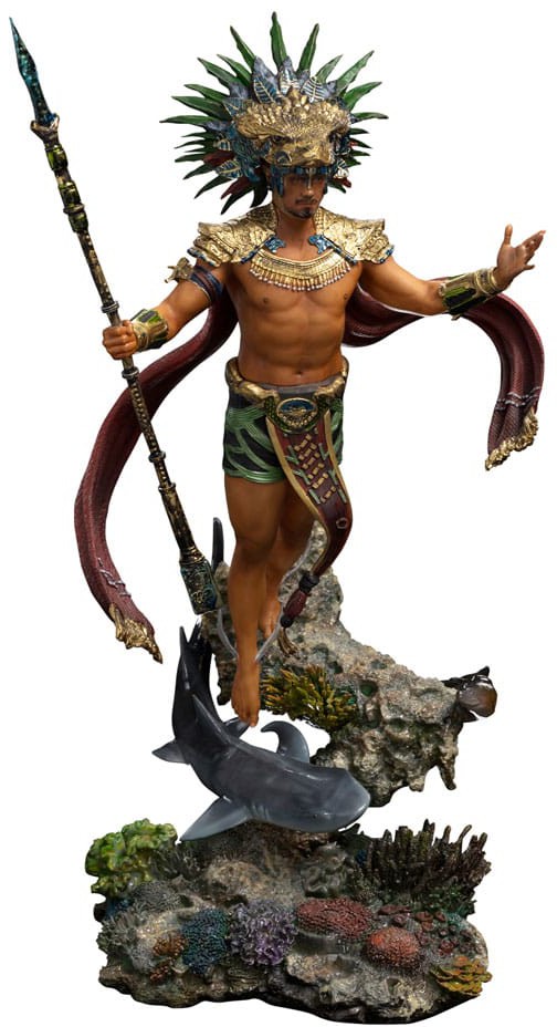 In the depths of the Gulf of Mexico, the monarch of an ancestral underwater kingdom floats on the water above a coral reef and sandy sediments, with a shark and a moray eel, two fearsome marine carnivores, swimming next to his feet with wings on its ankles, that allows him to fly outside water just like the geek god Hermes. Representing K'uk'ulkan, the Serpent God with Feathers, a Mesoamerican deity, he boasts an eccentric ceremonial helmet above his head, worn as a crown, only when he speaks as a king to his people. Wearing golden shoulder pads with red bands that come out of his back, green shorts with a golden belt and many ornaments, he firmly holds his spear made of vibranium in his right hand, ready for war. Inspired in Marvel's cinematographic version presented in the movie "Black Panther: Wakanda Forever", Iron Studios present the statue "King Namor Deluxe - Wakanda Forever - Art Scale 1/10" with the mutant antihero and antagonist, firstborn of Talokan, an old civilization of underwater inhabitants connected to the Maya peoples, played by Tenoch Huerta in the 30th movie of the MCU.