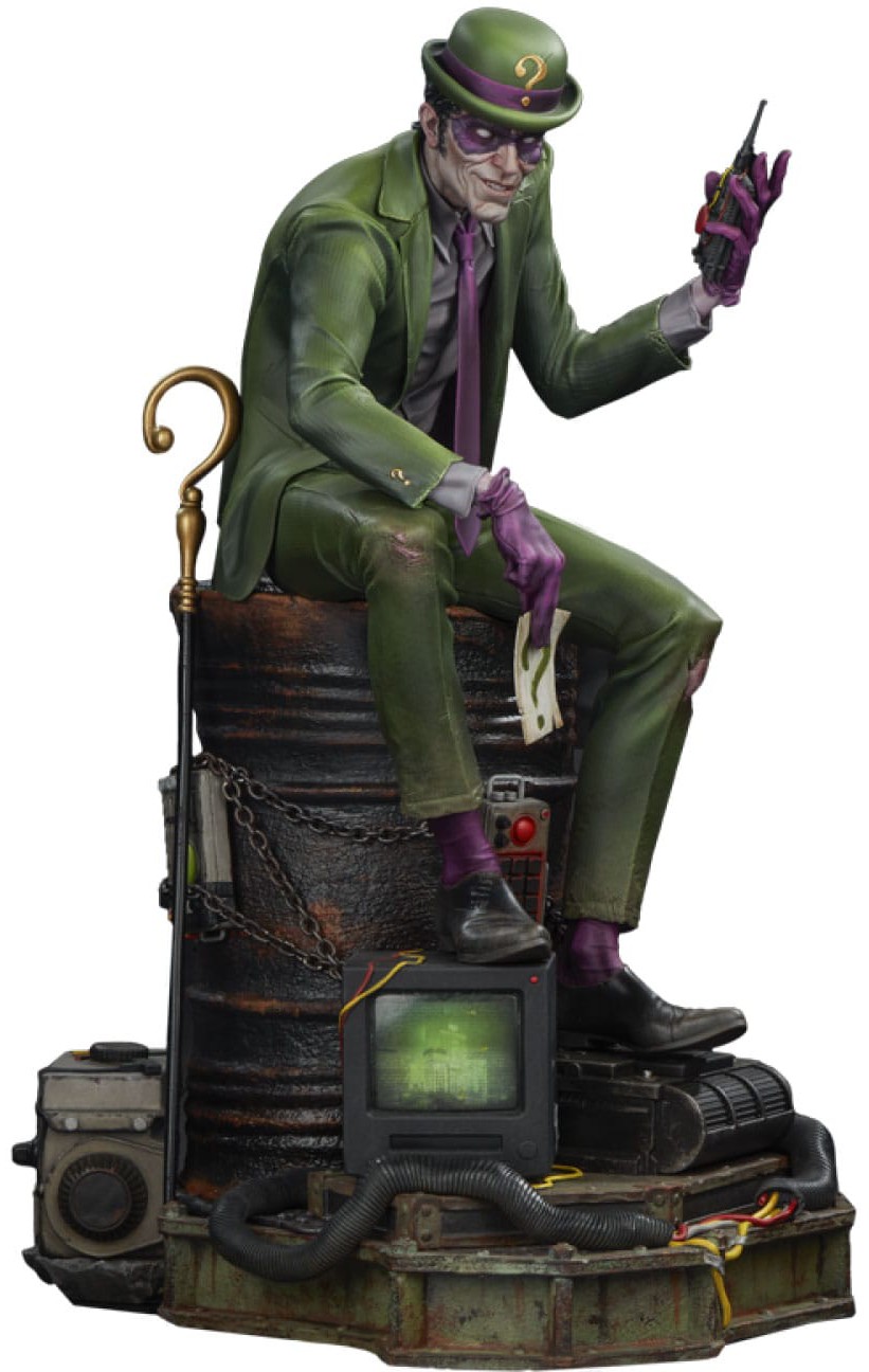 Figuren måler 49 cm i højden, 30 cm i bredden og 36 cm i dybden, og viser den egocentriske Edward Nygma, der håner Batman fra toppen af en sortlakeret tønde. Den slanke og psykopatiske taktiker holder en papirgåde i den ene hånd og en detonator i den anden. Omkring ham ligger spor og trusler – Wayne Tower-overvågning, bygningstegninger, elektronisk tastatur, spørgsmålstegerstav, generatorer, benzindunke, kæder og ledninger. Riddler har sat scenen – nu skal Batman samle brikkerne... eller dø i forsøget.