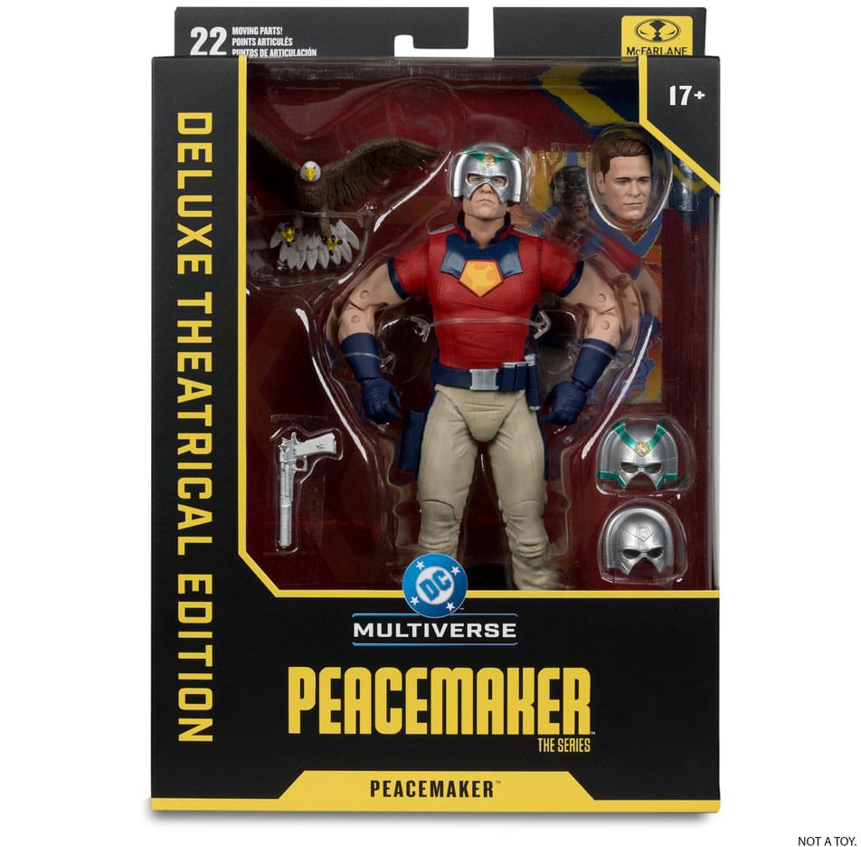 - Accessories include Peacemaker's "big gun", 3 interchangeable helmets, Eagly, unmasked head portrait and figure display base