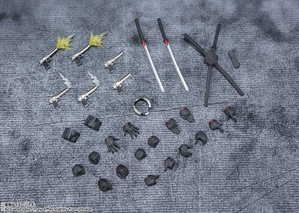 Set Contents: Main Body, Three pairs of optional eyes, Eight pairs of optional hands,Two swords, Scabbard, Gun (normal) x2, Gun (with firing effect) x2, Gun (with smoke effect) x2, Holster (x2), Knife, Knife case, Bomb collar