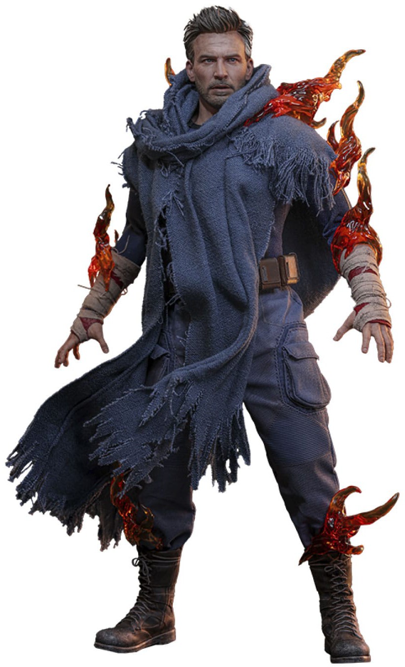 The highly accurate Human Torch collectible figure features a meticulously crafted Johnny Storm head sculpt with separate rolling eyeballs, highlighted by a specialized muscular physique. The Fantastic Four costume is faithful to its screen appearance and comes with a battle-damaged cloak. A series of different flaming effect accessories, attachable to the body, is provided for collectors to display the figure in style, including a special fire-whirling effect accessory that allows the flame to wrap around the Human Torch figure, as well as a stand to showcase the figure.