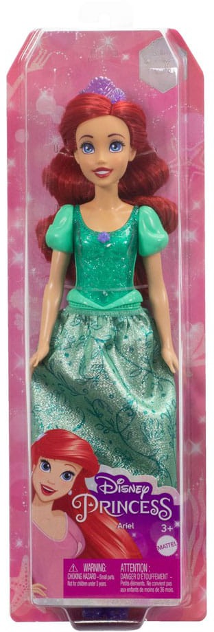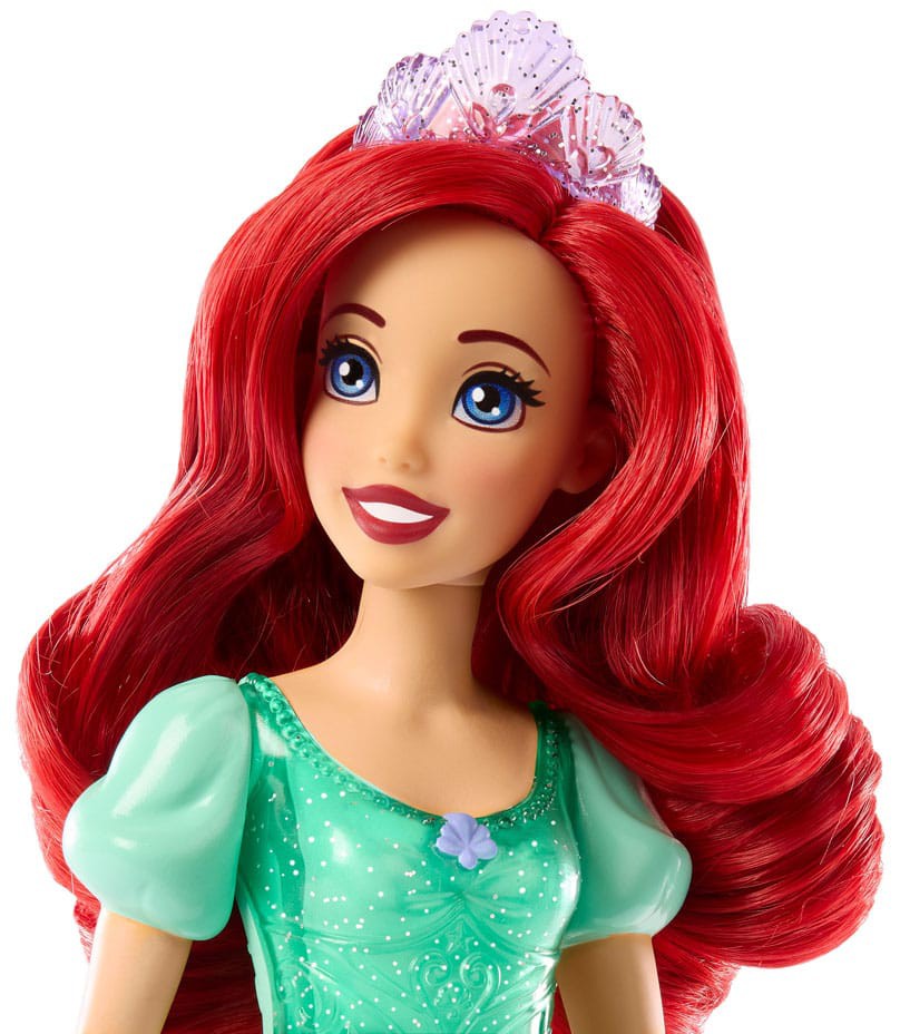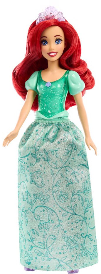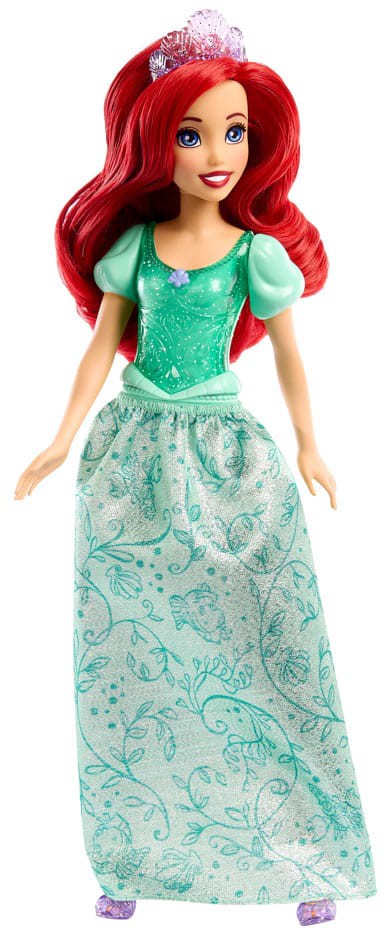 Meet this Ariel doll, inspired by the determined and free-spirited princess from Disney's The Little Mermaid. This posable fashion doll is shown in a sparkling outfit and accessories that include shoes and a tiara. In her signature look from the movie, this Ariel doll is ready for any adventure! Doll cannot stand alone.
