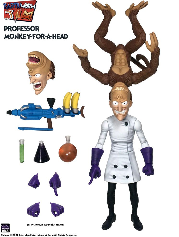 Den nye Premium DNA-actionfigur Professor Monkey For a head i skala 1:12 er 2 utrolige actionfigurer i én og er ca. 28 cm høj (14 cm for mennesket, 14 cm for aben). Professoren har 31 artikulationspunkter, og aben har 28 artikulationspunkter. Sættet indeholder 2 hoveder (skrigende og ikke-skrigende), 3 sæt hænder til både professoren og aben, 3 videnskabelige reagensglas/bægre, figurstativ og banandrevet blasterriffel!