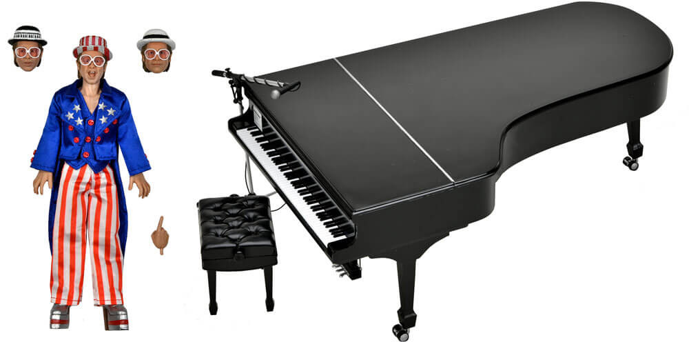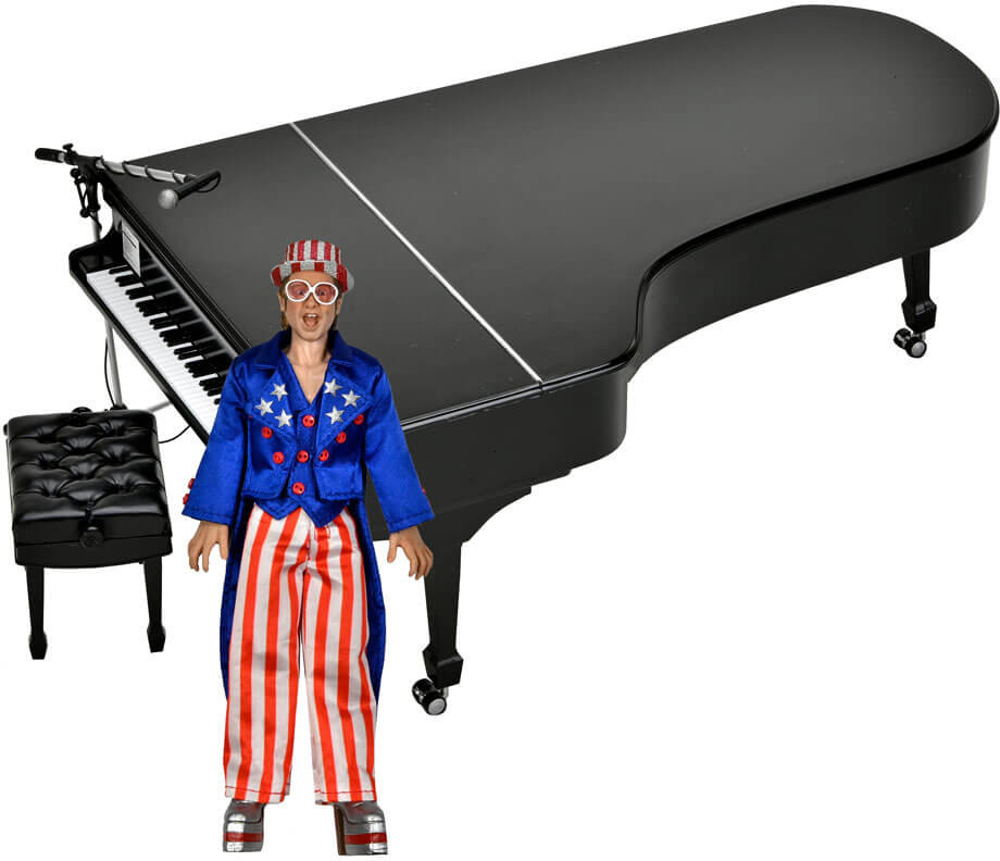 In partnership with Elton John, NECA has produced a second deluxe tribute to the legend and his profound influence on both music and fashion. The Elton John Live in '76 action figure set stands 8 inches (20.3 cm) tall and features the legend in his patriotic best: a shimmering coat-tail tuxedo resplendent in red, white, and blue. The "Louder Than Concorde (But Not Quite As Pretty)" Tour cemented Elton's status as a global phenomenon, and as appropriate we've included a massive 12-inch (30.5 cm) piano as it appeared during the tour! This deluxe set also includes a piano bench, microphone stand, interchangeable hands, and three interchangeable heads with different expressions.