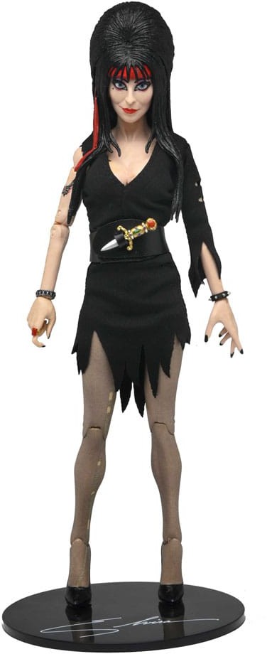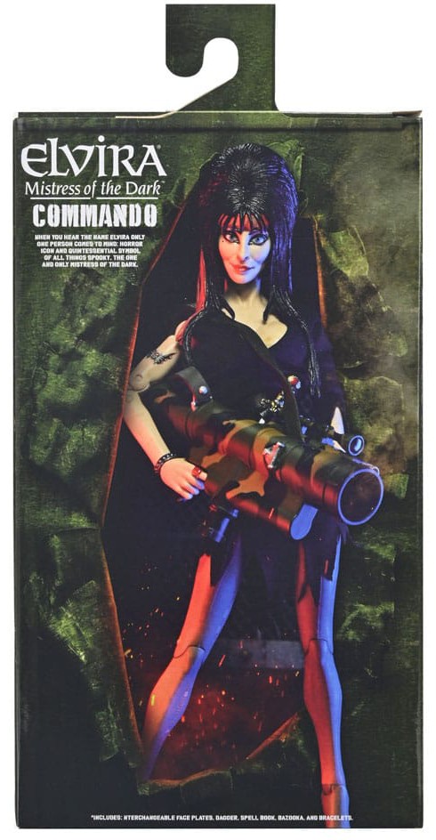 When Elvira inherits a house in a close-minded community, hijinks ensue in this camp classic comedy horror film. Get ready to be blown away by Commando Elvira! This 8-inch figure is fully articulated and features an all-new tailored dress to recreate the iconic movie scene. Accessories include all-new dagger, all-new bracelets, interchangeable faceplates with an all-new expression, Aunt Morgana's spell book, bazooka, and figure stand. Comes in window box packaging.