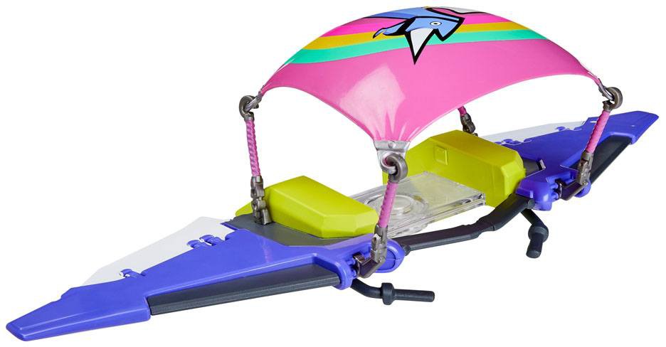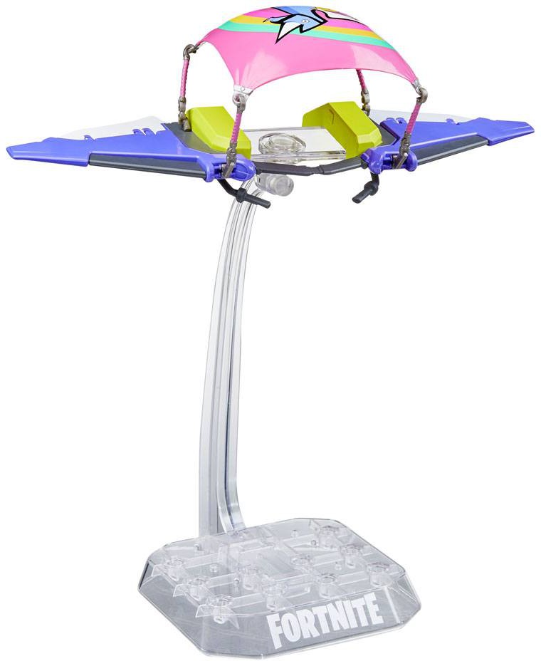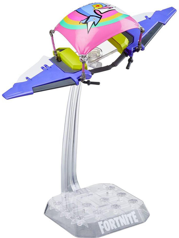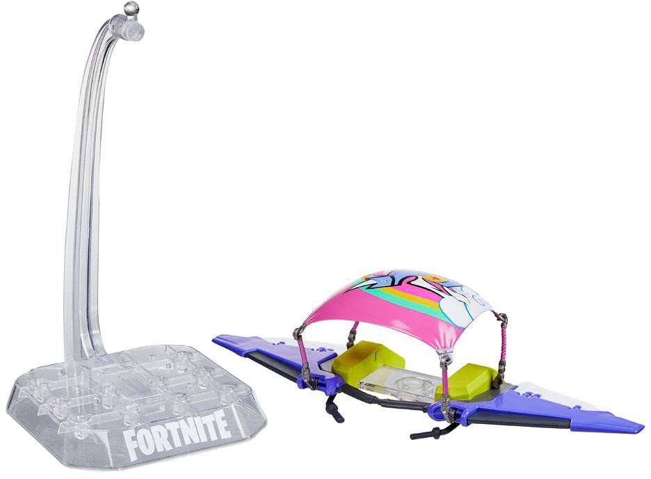 Get ready to jump off the Battle Bus and glide into action with the Llamacorn Express glider! The 6-inch glider features game-level detail and is designed with a ball joint, giving it a wide range of tilt and articulation, perfect for posing. Attach to the included display stand for game-inspired gliding poses. Victory Royale Series 6-inch figures can be posed out hanging off the handlebars.
