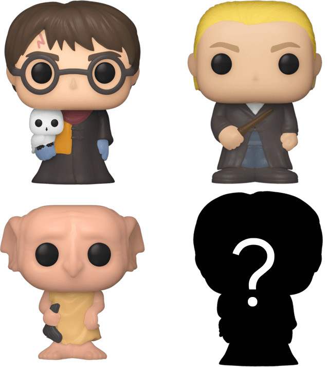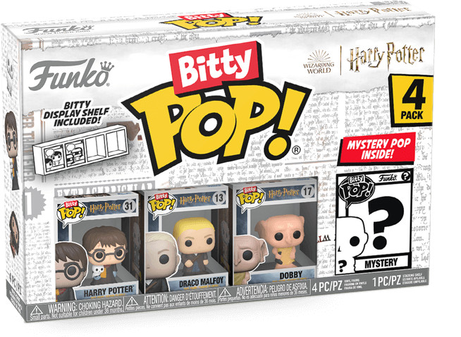 Denne 4-pakke indeholder Bitty Pop! Harry Potter, Bitty Pop! Draco Malfoy og Bitty Pop! Dobby og en mystisk Bitty Pop! figur. Den mulige mystiske Bitty Pops! figurer er Hyper Rare (1/6) Harry Potter (Quidditch), Hyper Rare (1/6) Hedwig, Rare (1/3) Fawkes og Rare (1/3) Severus Snape.