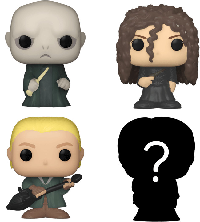 Denne 4-pakke indeholder Bitty Pop! Lord Voldemort, Draco Malfoy (Quidditch), Bellatrix Lestrange, og en mystisk Bitty Pop! figur. Den mulige mystiske Bitty Pops! figurer er Hyper Rare (1/6) Harry Potter (Quidditch), Hyper Rare (1/6) Hedwig, Rare (1/3) Fawkes og Rare (1/3) Severus Snape.