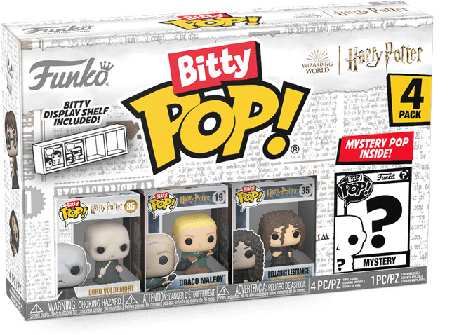 Diminuendo! Your favorite Harry Potter Pops! have been shrunk into Bitty Pops! Expand your Wizarding World collection with this assortment of Bitty Pop! figures featuring your most beloved Harry Potter characters! This 4-pack includes Bitty Pop! Lord Voldemort, Draco Malfoy (Quidditch), Bellatrix Lestrange, and a mystery Bitty Pop! figure. The possible mystery Bitty Pops! are Hyper Rare (1/6) Harry Potter (Quidditch), Hyper Rare (1/6) Hedwig, Rare (1/3) Fawkes, and Rare (1/3) Severus Snape.