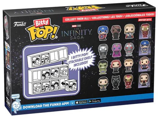 Bitty Pops! are packaged in hard acrylic cases with detachable bottom lids. Detachable bottom lids double as acrylic bases, to which the Bitty Pop! figures are adhered.