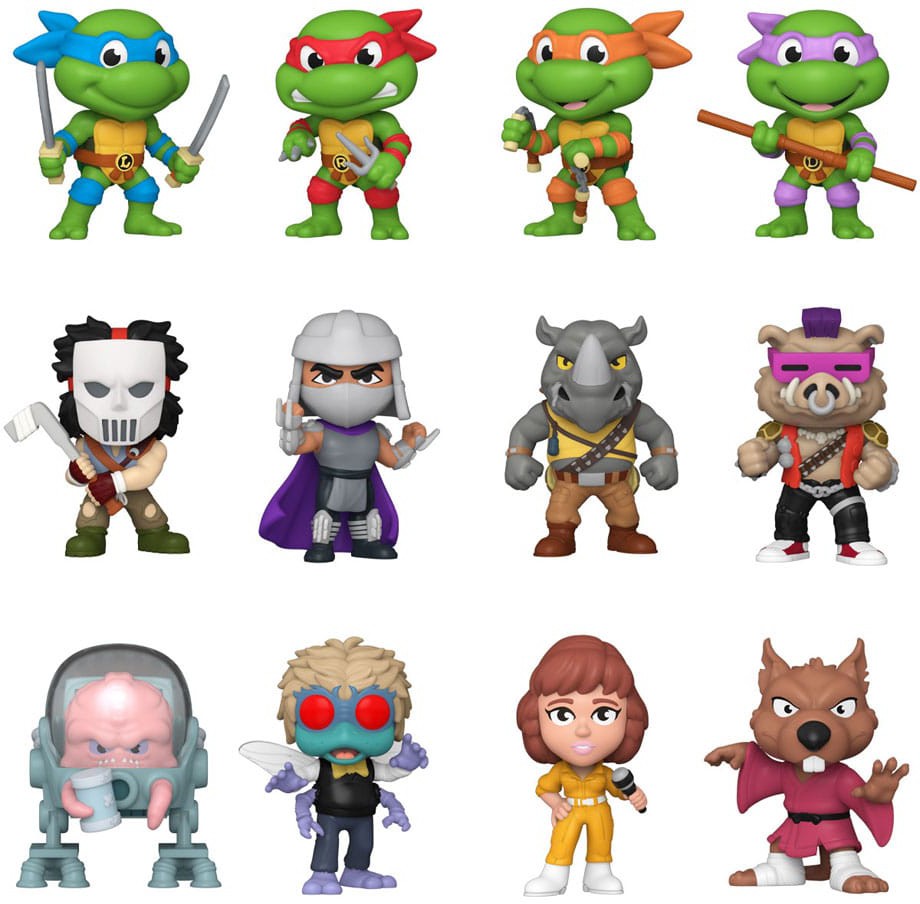 Små Teenage Mutant Ninja Turtles-samlefigurer i en blindbox fra Funko. Hver blindbox indeholder en af tolv forskellige samlefigurer. Så når du køber et eksemplar af dette produkt, får du en af de tolv samlefigurer på billedet.