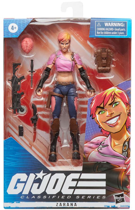 This Zarana figure comes ready for action, with multiple points of articulation for high posability and six character-inspired accessories. And with custom artwork by Marcus Williams, the G.I. Joe Classified Series Zarana packaging is sure to stand out on shelves.