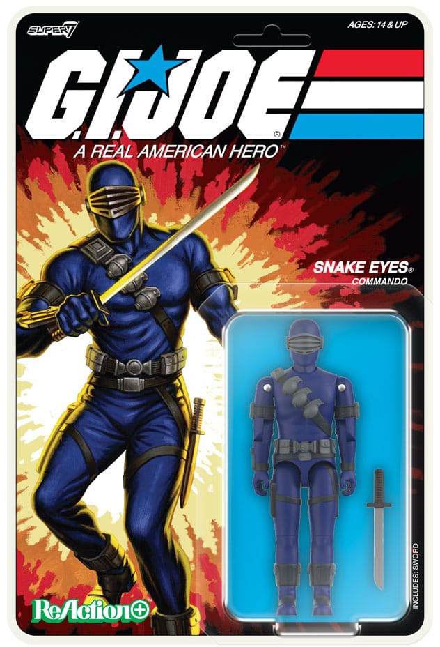 Snake Eyes, the G.I. Joe team's enigmatic ninja commando, is ready to strike in Super7's latest 3.75" scale ReAction+ Figure line! Inspired by the animated series G.I. Joe: A Real American Hero, this Snake Eyes figure features cartoon-accurate sculpt details and comes equipped with a sword accessory, ready to take on any covert mission. Packaged on a blistered cardback that evokes the classic G.I. Joe toy line of the early '80s, this figure is designed to look and feel like the vintage toys fans know and love. Featuring retro O-Ring construction and 12 points of articulation, Snake Eyes offers ultimate posability, whether he's silently infiltrating Cobra's stronghold or striking a dramatic pose on your shelf.