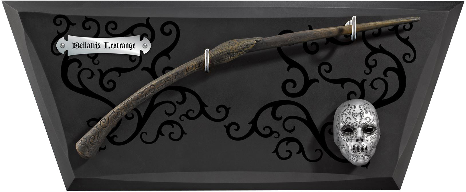 This authentic replica of Bellatrix´ wand, as seen in the Harry Potter films, measures approx. 35 cm in length. It comes with a cool wall display, including a name plate and a miniature death eater mask.