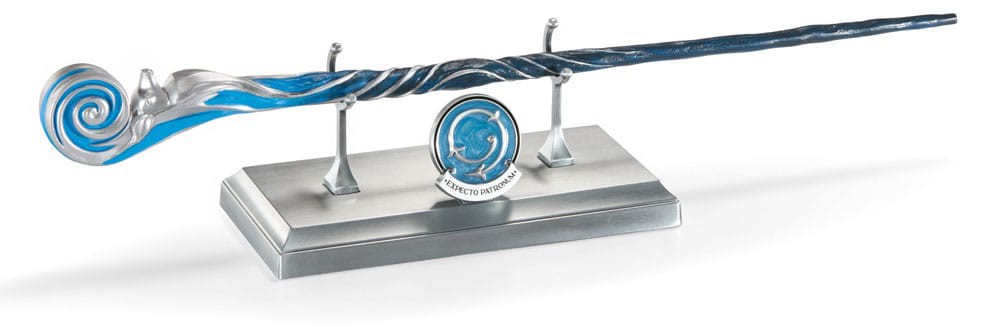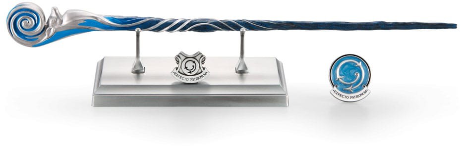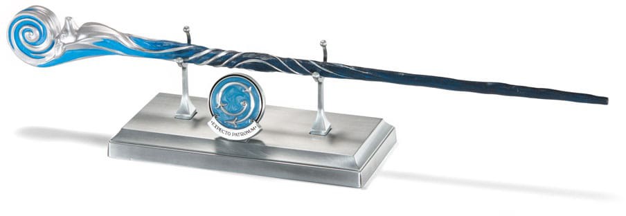 A limited edition Harry Potter collectible wand inspired by the Patronus Charm. Includes a silver-toned metal display stand and a removable pin with the incantation and movement for the spell.