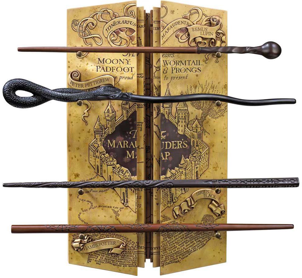 Mounted on a resin, hand painted wall display of the Marauders Map, which measures 36 x 21 cm are four wands, those of Remus Lupin, Sirius Black, James Potter and an exclusive Peter Pettigrew.
