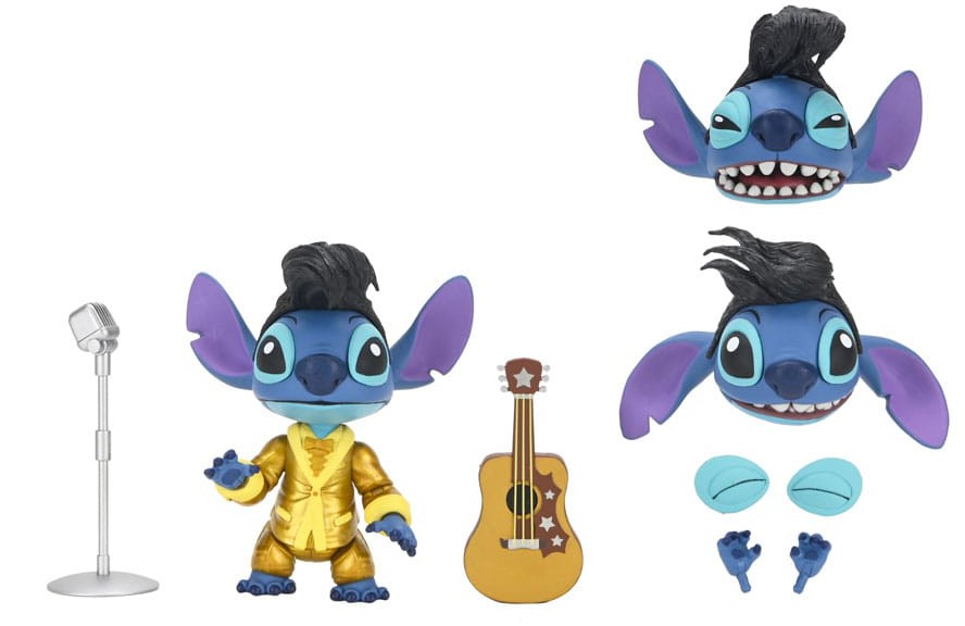 Dressed up in an iconic Elvis outfit, this Disney Stitch articulated figure stands over 3 inches tall and is ready to perform all the hits! Accessories include interchangeable heads, hands, hair pieces, and eye plates, plus guitar and microphone stand. Comes in collector-friendly packaging.