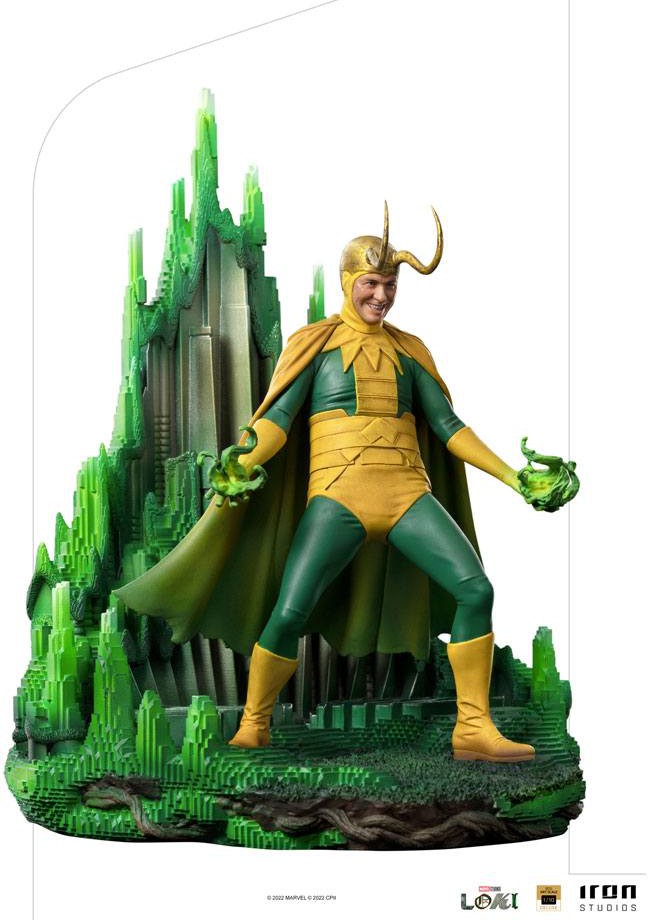 As the Asgardian sorcerer master, his magic deeds are seen by others as nearly impossible, and at the height of his abilities, with pure mystic energy hatching from the palms of his hands, the experient God of Mischief's figure with green and yellow leotard suit, yellow cape, and golden helmet with horns, uses his power to the fullest on a pedestal on which he creates an illusion of the Asgard palaces as a trick to call the attention and deceive the trans-temporal entity guardian of the Void named Alioth. With an audacious smile on their face, Iron Studios bring the statue "Classic Loki Variant Deluxe BDS - Loki - Art Scale 1/10", presenting Thor's fearless adoptive brother, inspired by his classic version in the comics, presented in the Loki series from the streaming service Disney+.
