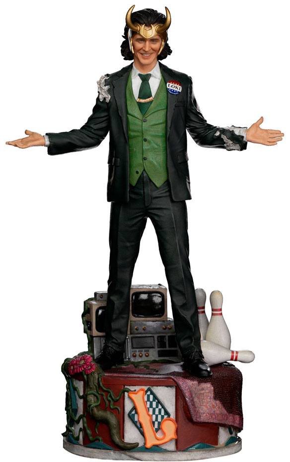 In a place out of time and space, in the underground hideout where alternate versions of the God of Mischief coexist, one of them, in the position of a leader, expresses his plan of completely taking control, surrounded by his followers. Arrogant and narcissist, he displays in his head a smaller version of his helmet with horns and dresses a formal suit with waistcoat and tie in shades of green, yet a bit ragged and worn out, but still aligned to the job that he wishes to conquer. Without "losing the hand" of their future releases, Iron Studios present the statue "Loki President Variant - Loki - Art Scale 1/10", with the elected commander of the army of Loki's variants.