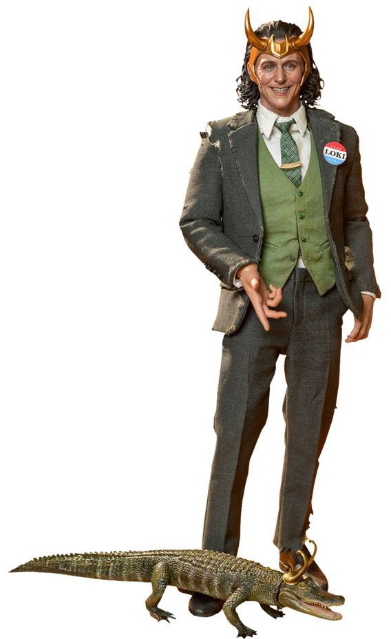 Exquisitely crafted based on the screen appearance of Tom Hiddleston as President Loki in the series, the figure features a newly developed head sculpt and his horned helmet with delicate craftsmanship, election campaign pin on the suit applied with weathering effects perfectly translating the details; a pair of daggers, greatly detailed accessories such as Alligator Loki in one-sixth scale, a cane, a specially designed character backdrop with lenticular effect, and a themed figure stand.