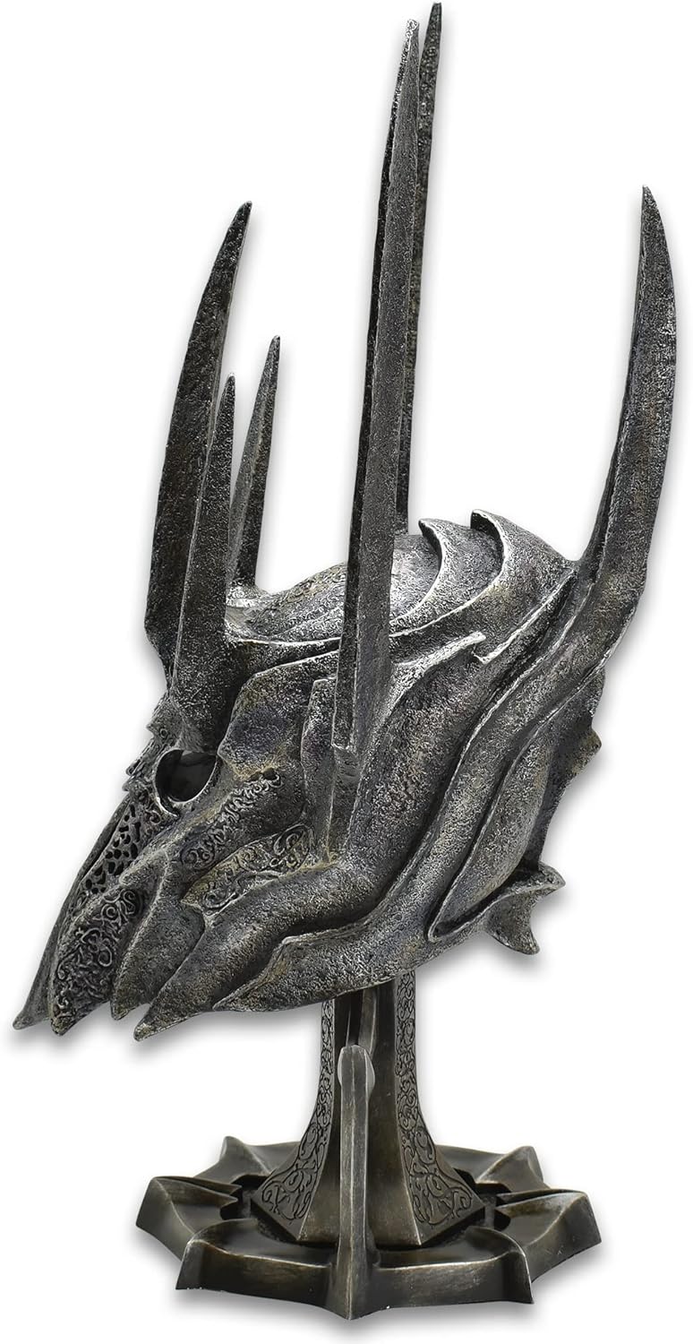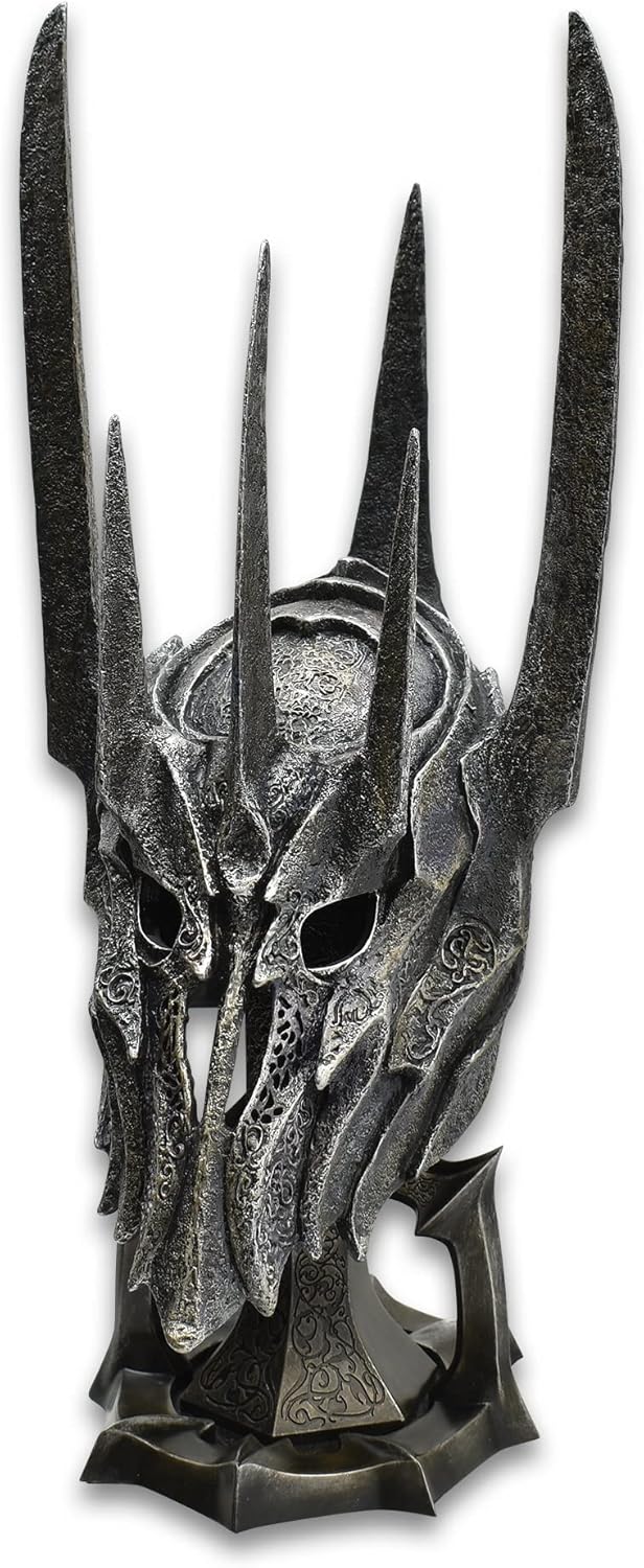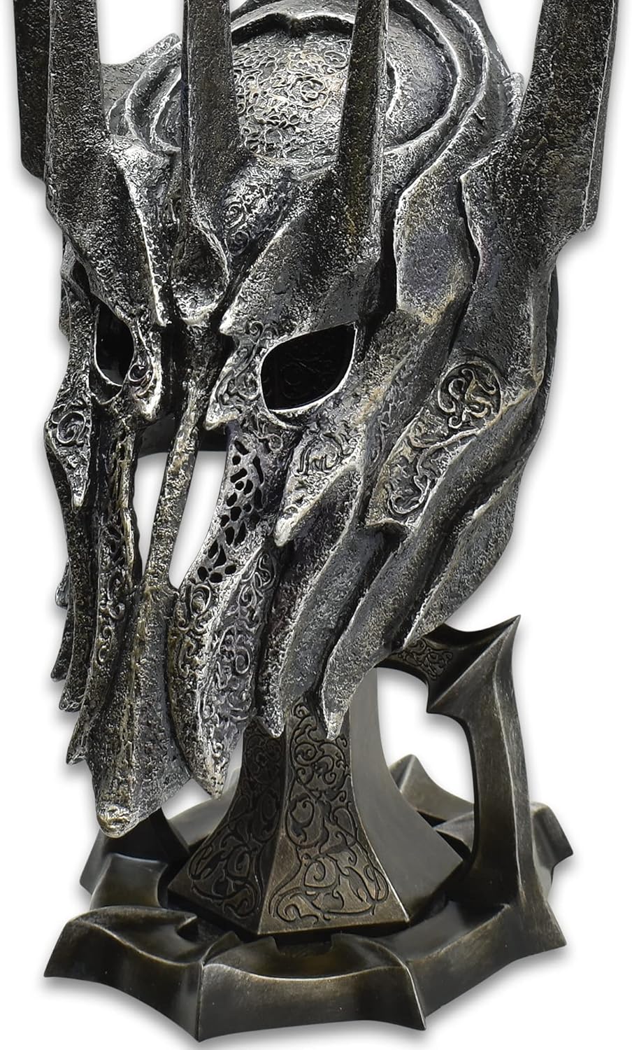 A 1/2 scale replica of the blackened steel war helm of the Dark Lord Sauron™, as seen in the motion picture, THE LORD OF THE RINGS: THE FELLOWSHIP OF THE RING™. This 1/2 scale polyresin replica is 15 1/2" tall. It features weathered intaglioetched surface sculpting and blackened steel coloring that precisely match the original movie prop. It is presented with a polystone display stand sculpted in the same styling as the mace and armor of Sauron™ and includes a certificate of authenticity.