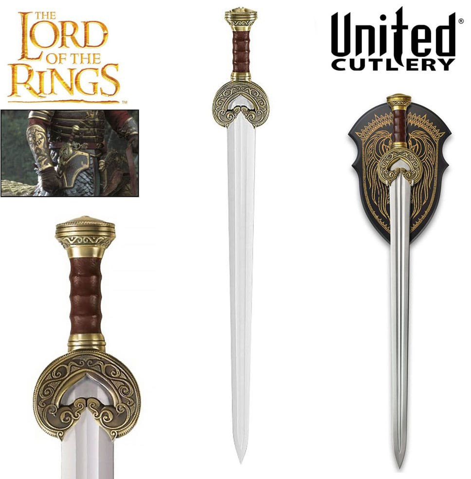 This new Battle Forged edition of the popular Herugrim sword from The Lord of the Rings films is made in the traditional manner with a full tang, tempered 1070 high carbon steel blade (false edged), and lost wax cast hilt parts. The blade features a double fuller and a full tang that is peened through the pommel, just like the real-steel hero filming props. The hilt features a solid brass guard and pommel with fine detailing and an aged and worn finish. The genuine leather-wrapped grip is shaped from real wood. Herugrim comes with a black and gold wood wall display and a certificate of authenticity.