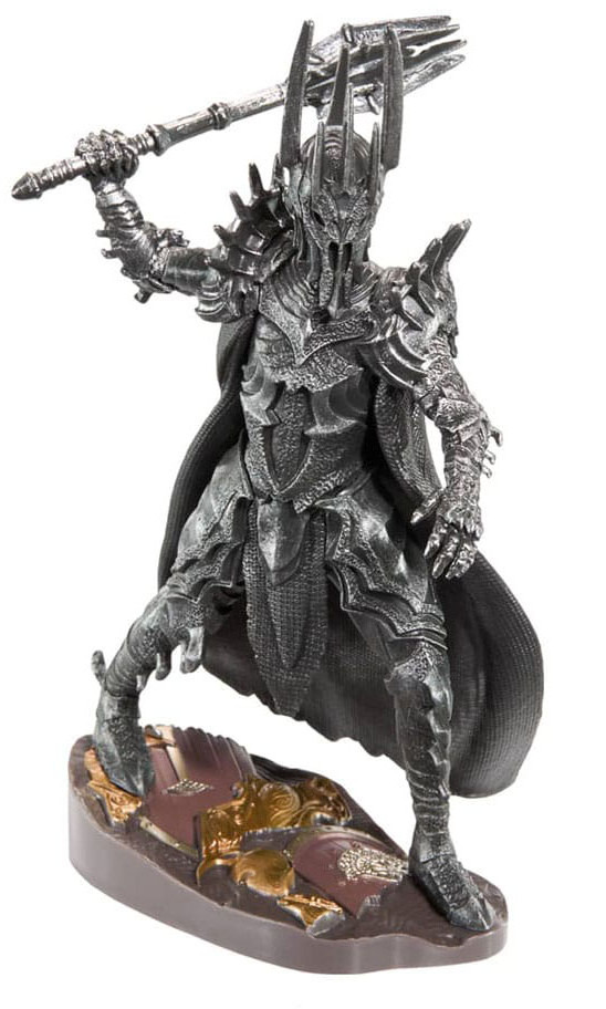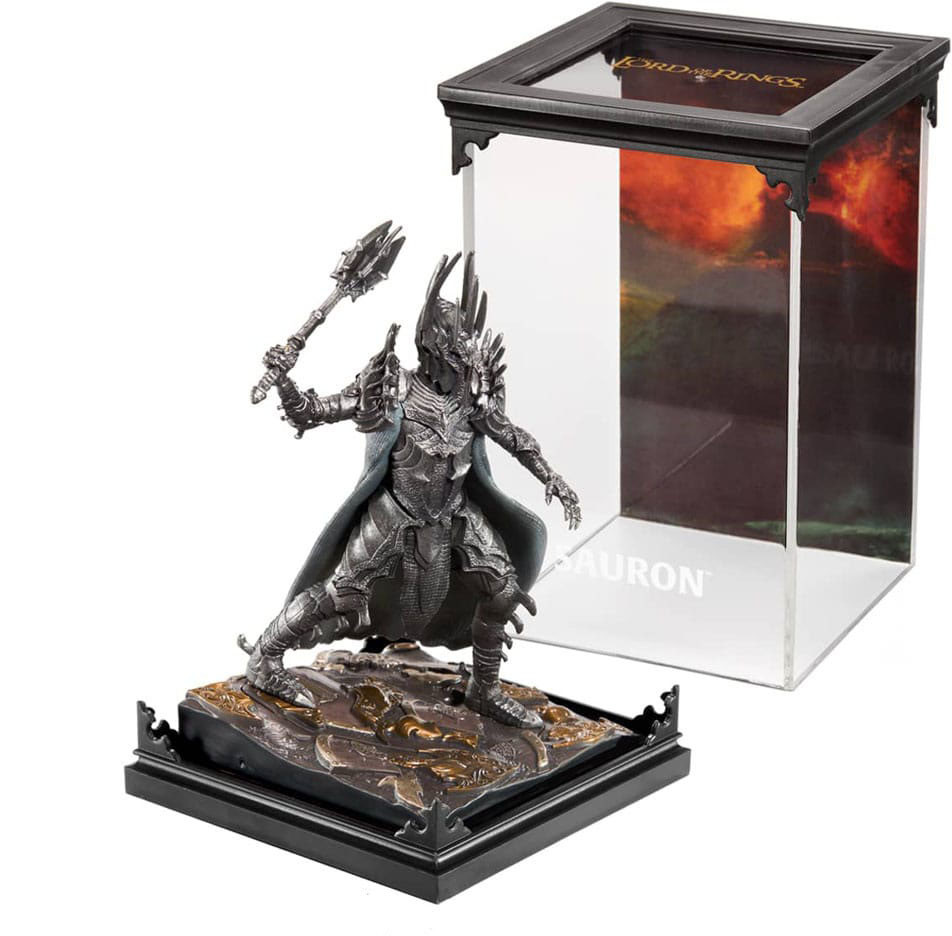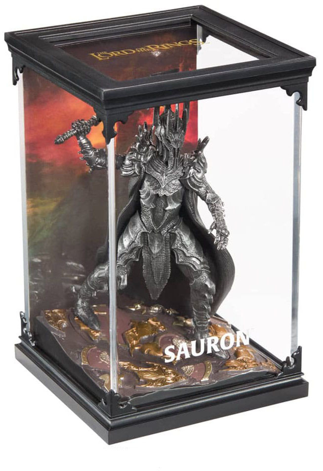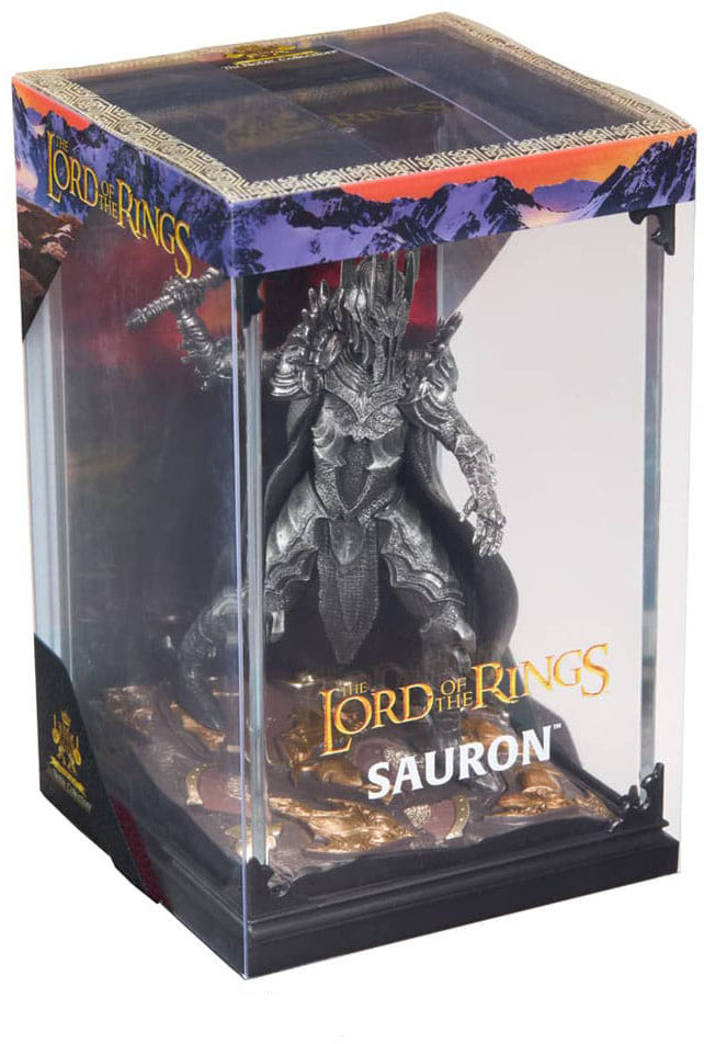 En fint udformet, indviklet malet skulptur af Mørkets Fyrste Sauron. Dette tredelte diorama omfatter et låg med baggrund, en base og en aftagelig figur af Sauron. Måler ca. 17 cm i højden. PVC-figur i akrylboks.