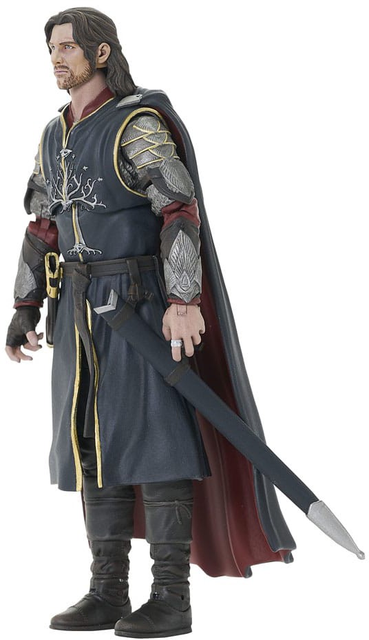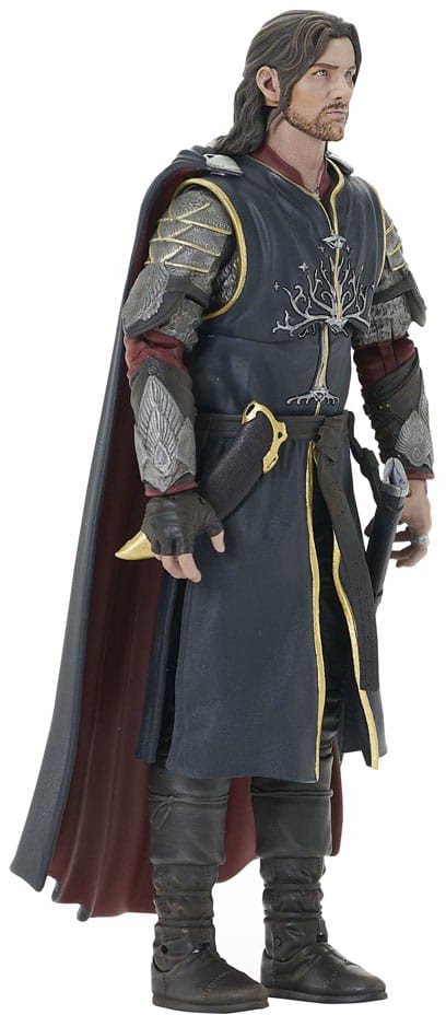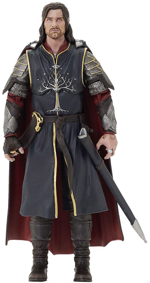 It's the return of the king! The landmark 10th series of Lord of the Rings movie action figures from DST includes the man himself, Aragorn, in his royal garb, worn at the Battle of the Pelennor Fields and featuring the emblem of the White Tree of Gondor. Featuring film likenesses and multiple points of articulation, the figure comes packaged in a full-color window box. Designed by Eamon O'Donoghue, sculpted by Gentle Giant Studios!
