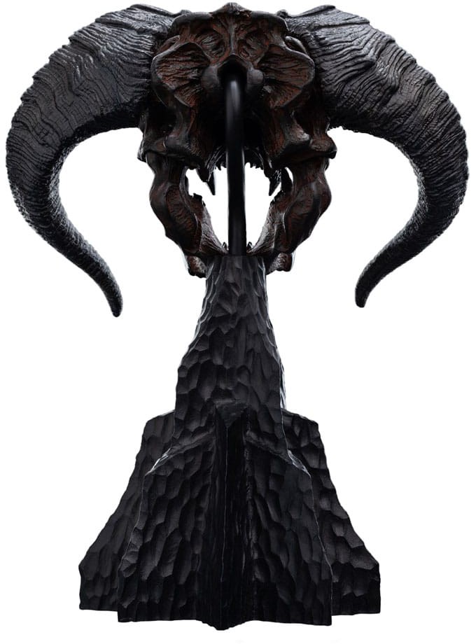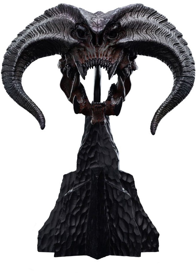 The skull of a Balrog is an exceptionally rare specimen; due to the creature's transient nature-composed of shadow and flame-powerful and complex arcane methods were employed to achieve calcification of its remains. This preservation presents an invaluable opportunity to study the ancient origins and dark power that define this formidable being. Massive in scale, the skull of this Balrog displays elongated, curving horns reminiscent of a goat's, which appear to fuse seamlessly with the frontal bone to form a protective, armour-like carapace. The supporting bone structure is distinguished by a network of ridges with minimal flat surfaces, indicative of a creature developed to endure intense heat and pressure. This specimen also possesses multiple sets of fanged outer dentition, complemented by dense rows of large molars, indicating a specialized design for both piercing and grinding. The robust jaw structure points to an immense biting force, maximizing its destructive potential. Each anatomical feature reveals a creature shaped for dominance, resilience, and a primordial bond with fire.