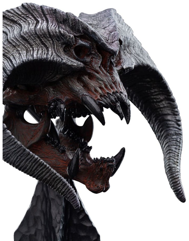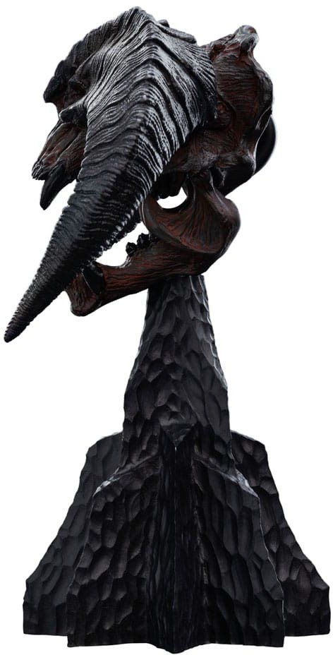 Et Balrog-kranie er et usædvanligt sjældent eksemplar; på grund af væsenets flygtige natur - bestående af skygge og flamme - blev der brugt kraftfulde og komplekse arkaiske metoder til at få dets rester til at forkalkes. Denne bevaring giver en uvurderlig mulighed for at studere den ældgamle oprindelse og den mørke kraft, der definerer dette formidable væsen. Balrogs kranium er massivt med aflange, buede horn, der minder om gedens, og som ser ud til at smelte sammen med pandebenet og danne en beskyttende, panserlignende kappe. Den bærende knoglestruktur er kendetegnet ved et netværk af riller med minimale flade overflader, hvilket tyder på et væsen, der er udviklet til at udholde intens varme og tryk. Dette eksemplar har også flere sæt savtakkede udvendige tænder suppleret med tætte rækker af store kindtænder, hvilket tyder på et specialiseret design til både piercing og slibning. Den robuste kæbestruktur peger på en enorm bidekraft, der maksimerer dens destruktive potentiale. Hvert anatomisk træk afslører et væsen, der er formet til dominans, modstandsdygtighed og et oprindeligt bånd til ild. MINIATURE KRANIER: EN KURATERING AF MIDDLE-EARTH. Hvert miniaturekranie er en kompakt, men detaljeret genstand, som giver et dybt indblik i anatomien i Middle-earth. Udvid din samling med denne unikke samling, og udforsk disse væsener som aldrig før.