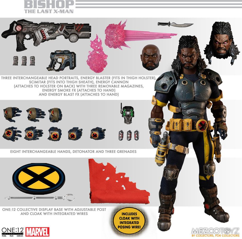 The One:12 Collective Bishop is prepped and ready for battle, outfitted in an X-Men issued suit with fortified chest armor, multiple holsters to hold his heavy artillery, and a removable paludamentum that drapes freely over his shoulder. Included are three head portraits - a scowl, an angry stare, and a modern bald head portrait, allowing for a multitude of distinct looks.
