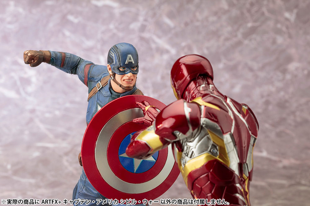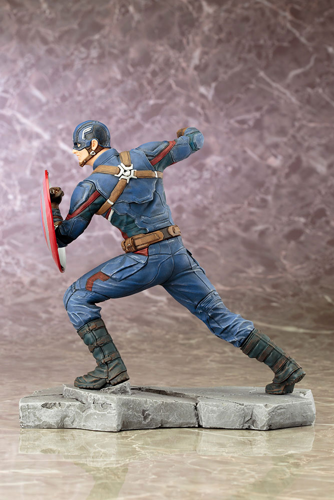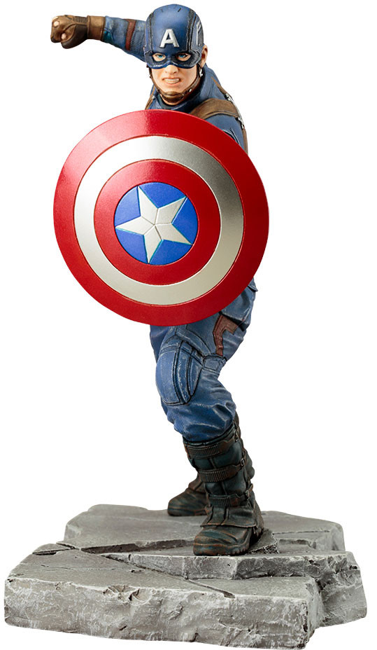 A Japanese import 1/10 scale ARTFX+ statue brought to you by Kotobukiya. Captain America as seen from the movie Captain America: Civil War. Sculpted and painted in detail from his shield, mask, folds in his clothes, down to the rubbled ground, Captain America raises his fist as he guards himself with his shield, ready to stop his friend.