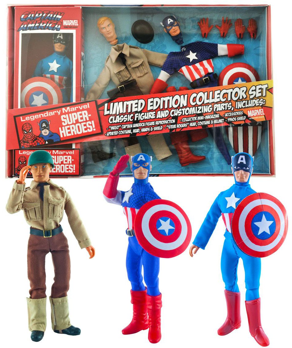 The 1970s live again! The response to DST´s new Marvel Retro line has been overwhelming, as fans quiver in anticipation of getting their hands on reproductions of the classic Marvel Mego figures of yesteryear. Now, DST is proud to reveal the next Marvel gift set, featuring Captain America! A reproduction of the vintage Captain America figure comes packaged inside a reproduction window box, alongside two alternate heads, two all-new costumes and a variety of accessories. Dress your vintage Cap figure up as either World War II soldier Steve Rogers or a more realistic version of Captain America! Includes both the original and classic shields, as well as a booklet on the history of Megos! Set comes packaged in a deluxe gift tray. Designed and sculpted by EMCE Toys!
