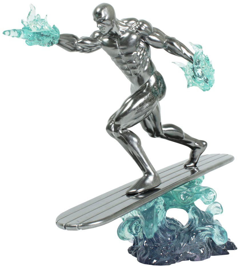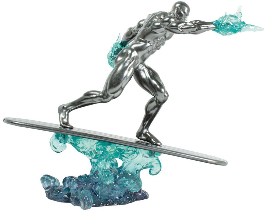 Through the spaceways he soars! The Silver Surfer is an iconic member of the Marvel Universe and this Gallery Diorama captures him in all of his glittering glory! Measuring approximately 10" tall, this PVC sculpture shows Norrin Radd on his board, with clear blue energy surrounding his hands to represent the Power Cosmic! It comes packaged in a full-color window box. Designed by Nelson X. Ascencio; sculpted by Alterton.