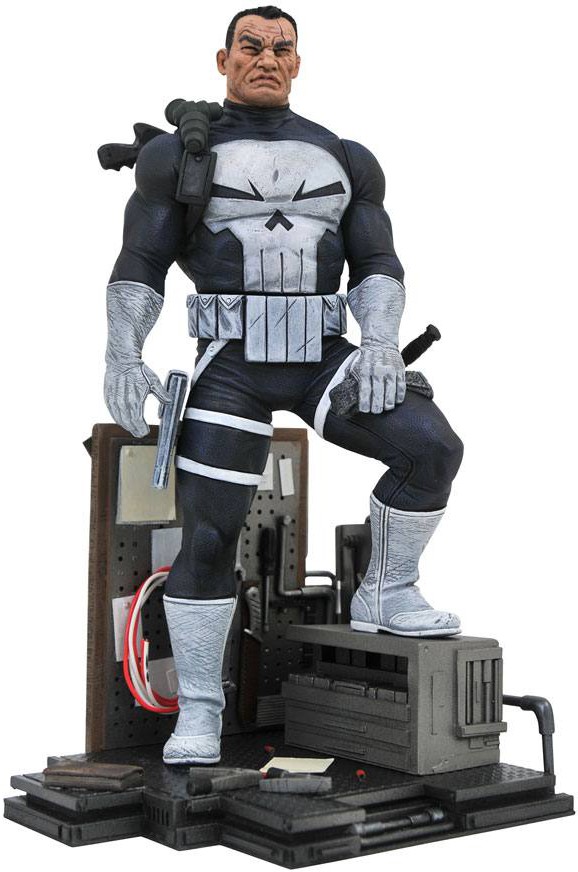 The Punisher is getting ready to go out on a hit, and you are there! This all-new Gallery PVC diorama depicts the Punisher in his workshop, surrounded by tools, knives, jumper cables ... Frank Castle needs for a successful night on the town.
