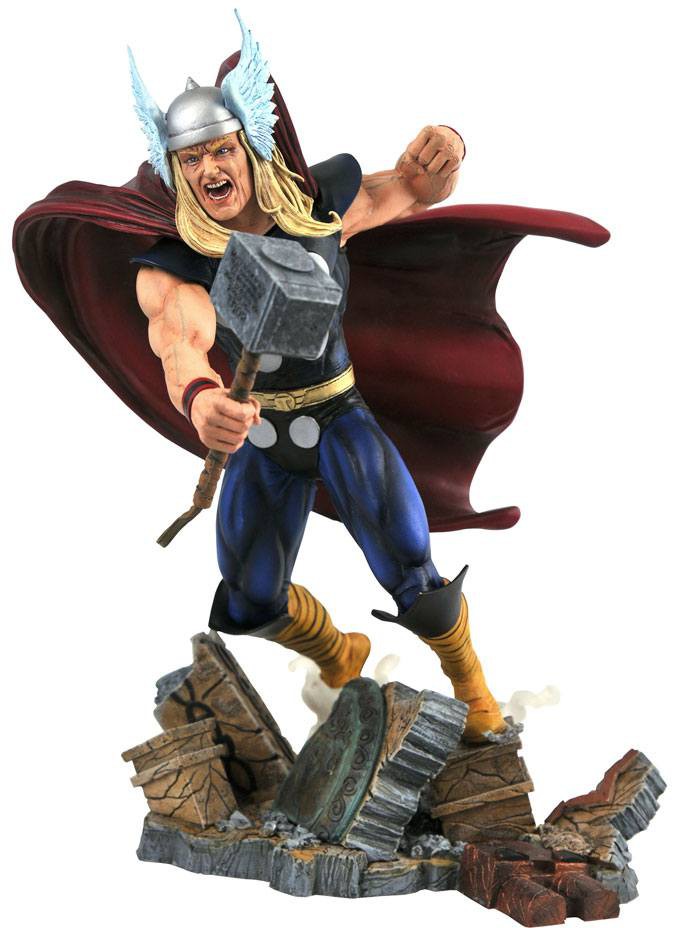 This diorama be worthy! Thor makes his classically-styled debut in the Marvel Gallery line of PVC dioramas with this all-new sculpt! Posed swinging his hammer on a rubble-strewn base, this sculpture of the God of Thunder is part of a new series of battle-inspired scenes. This piece stands approximately 9" tall, features detailed sculpting and paint applications and comes packaged in a full-color window box. Designed by Nelson X. Asencio, hand-sculpted by Jean St. Jean!