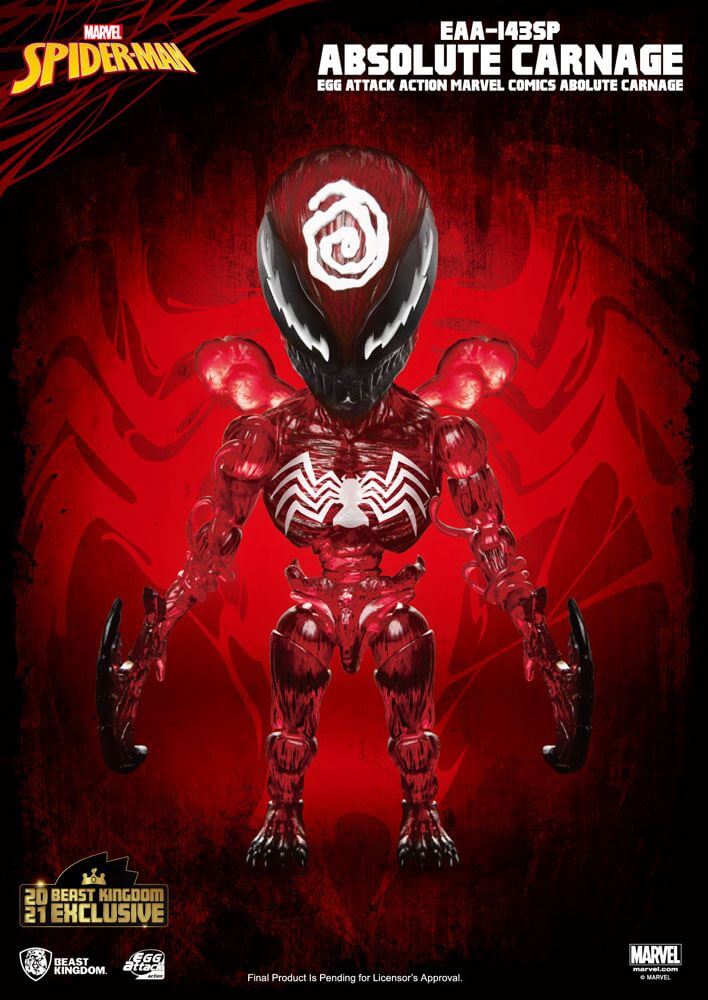 The EAA (Egg Attack Action) brand of highly stylized and articulable action figures from Beast Kingdom, takes on the crazed villain from outer space in a limited edition release. Using the very best in manufacturing techniques, Carnage is brough to life with an immense attention to detail. A translucent body showcases the otherworldly visage of the angry alien, with a light up function in the Carnage head sculpt to really showcase his demonic look.