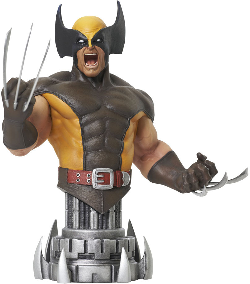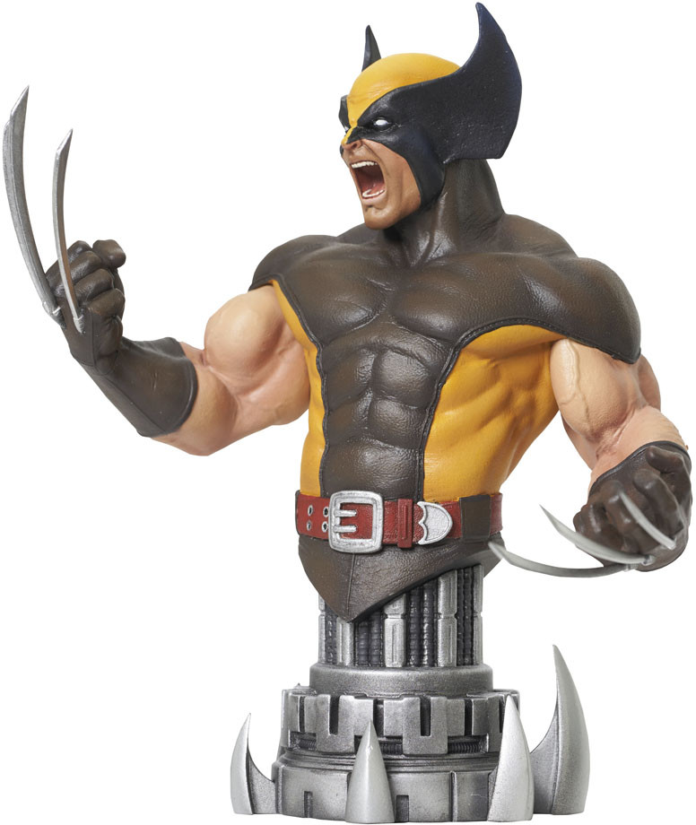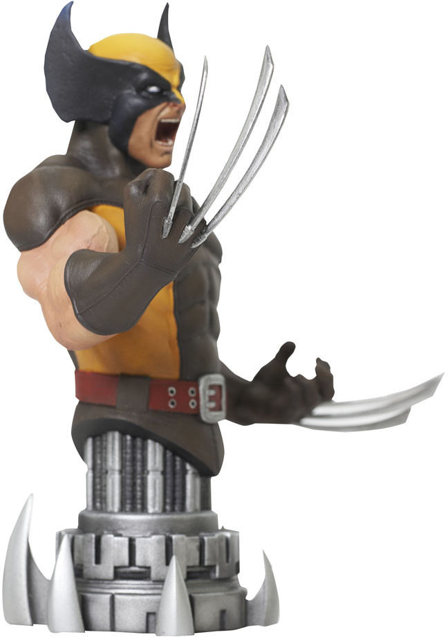 Snikt! The berserker X-Man known as Wolverine is the newest 1/7 scale mini-bust in the Marvel Comics line! Wearing his classic brown costume and with his claws bared, this resin mini-bust of Logan stands approximately 5.5" tall atop an adamantium claw base, and features real metal claws! Limited to only 3000 pieces, it comes packaged in a full color box with a numbered certificate of authenticity. Designed by Nelson Asencio, sculpted by Juan Pitluk!