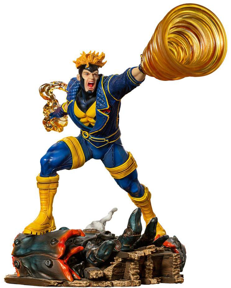 The base is composed of what was once part of the wooden floor of Mansion X, along with the remains of a molten metallic Sentinel robot hand. Standing on top of the base is the mutant hero wearing a blue and yellow uniform, the standard 1990s uniform from Professor X's group of students and allies, the so-called X-Men. With all his style and personality and still wearing a jacket, the mutant releases his plasma energy power through his right hand while firing a cosmic ray vortex from his left hand. Thus, Iron Studios presents the statue "Havok - X-Men - Bds Art Scale 1/10", one more item among the classic Marvel mutant heroes. The collection features the diorama scenario of the X-Men facing Magneto, the Sentinel robots under his control, and his followers and allies.