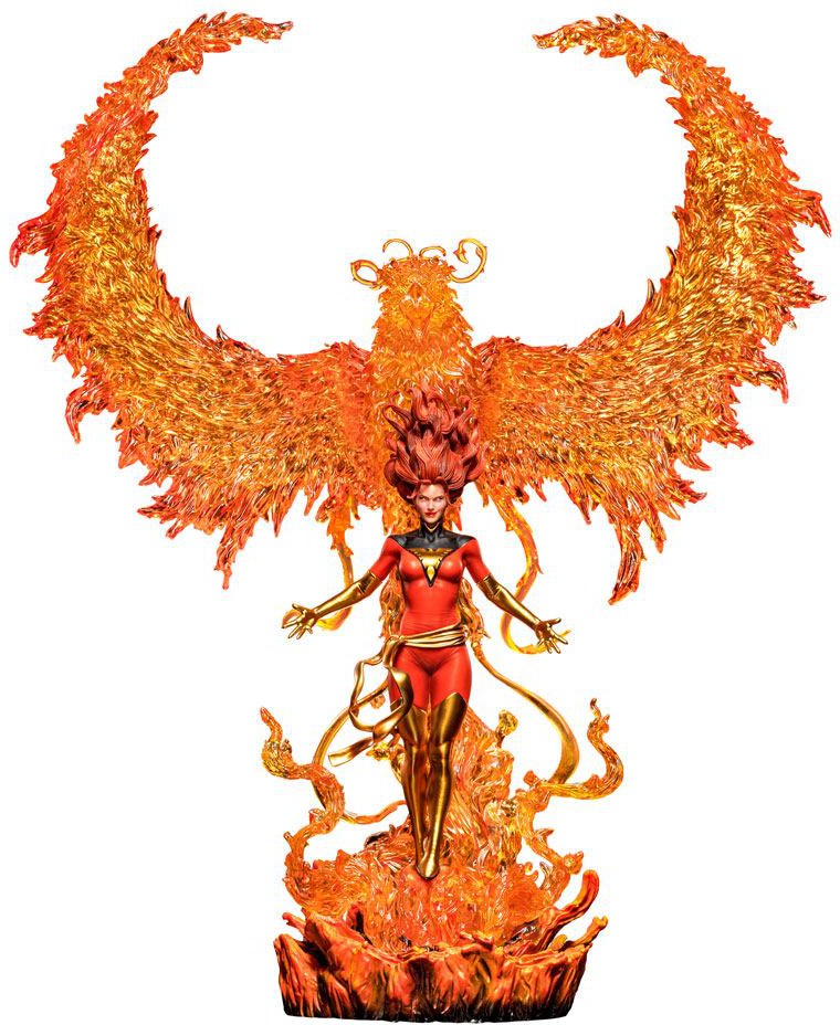 Emerging from a pedestal made of energy flames, a female figure with power and unlimited potential floats over a translucent fire, with her long red-haired hair lifted by her powers and wearing a skin-tight red, black and golden costume, she is one of the most feared and powerful cosmic entities in the Marvel Universe. Iron Studios, in their X-Men collection that forms a diorama with the main Marvel's mutant heroes facing Sentinel Robots controlled by Magneto and a legion of villains to back him up, now bring the entity "Phoenix Deluxe - XMen - BDS Art Scale 1/10", that presents in its pedestal the majestic mythologic