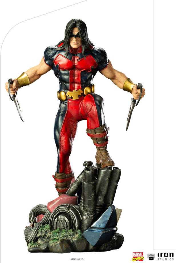 Wielding his vibranium bowie knives, the Native American warrior Apache scales the metallic remains of a fallen Sentinel robot. With an eagle on his chest and his belt buckle, the symbol of his courage and strength, his red and blue uniform, the colors of the classic costume, honors the legacy of his brother known as Thunderbird, who died fighting alongside the group of mutant heroes created by Professor X. The mighty mutant hero prepares to leap over any opponent that threatens his allied brothers from the X-Men group. Iron Studios proudly presents the "Warpath - X-Men - BDS Art Scale 1/10" statue, a formidable fighter, both armed and unarmed.