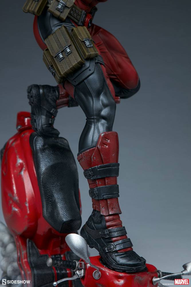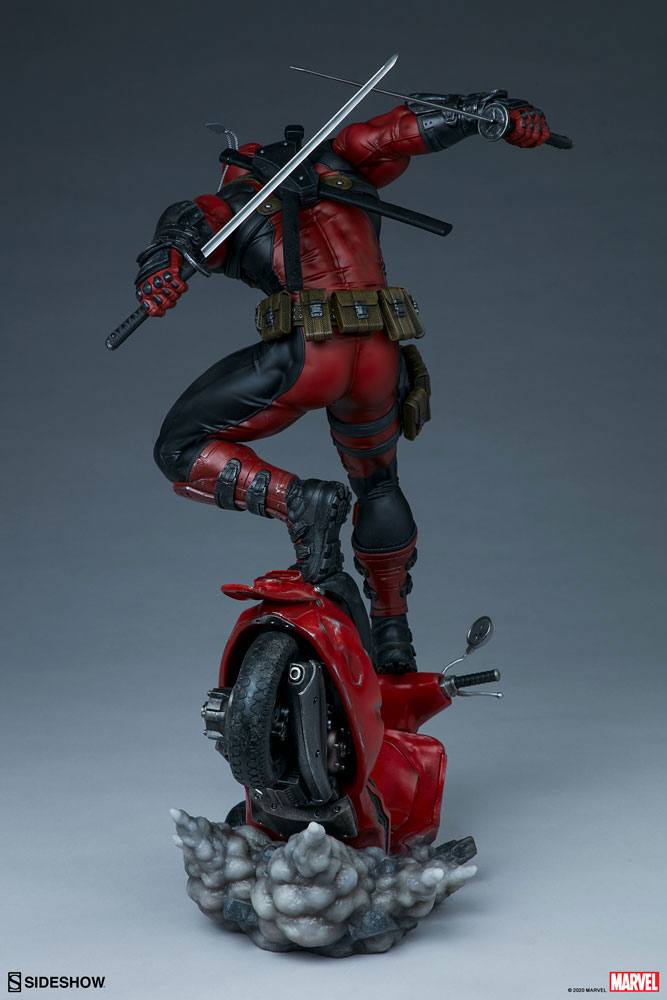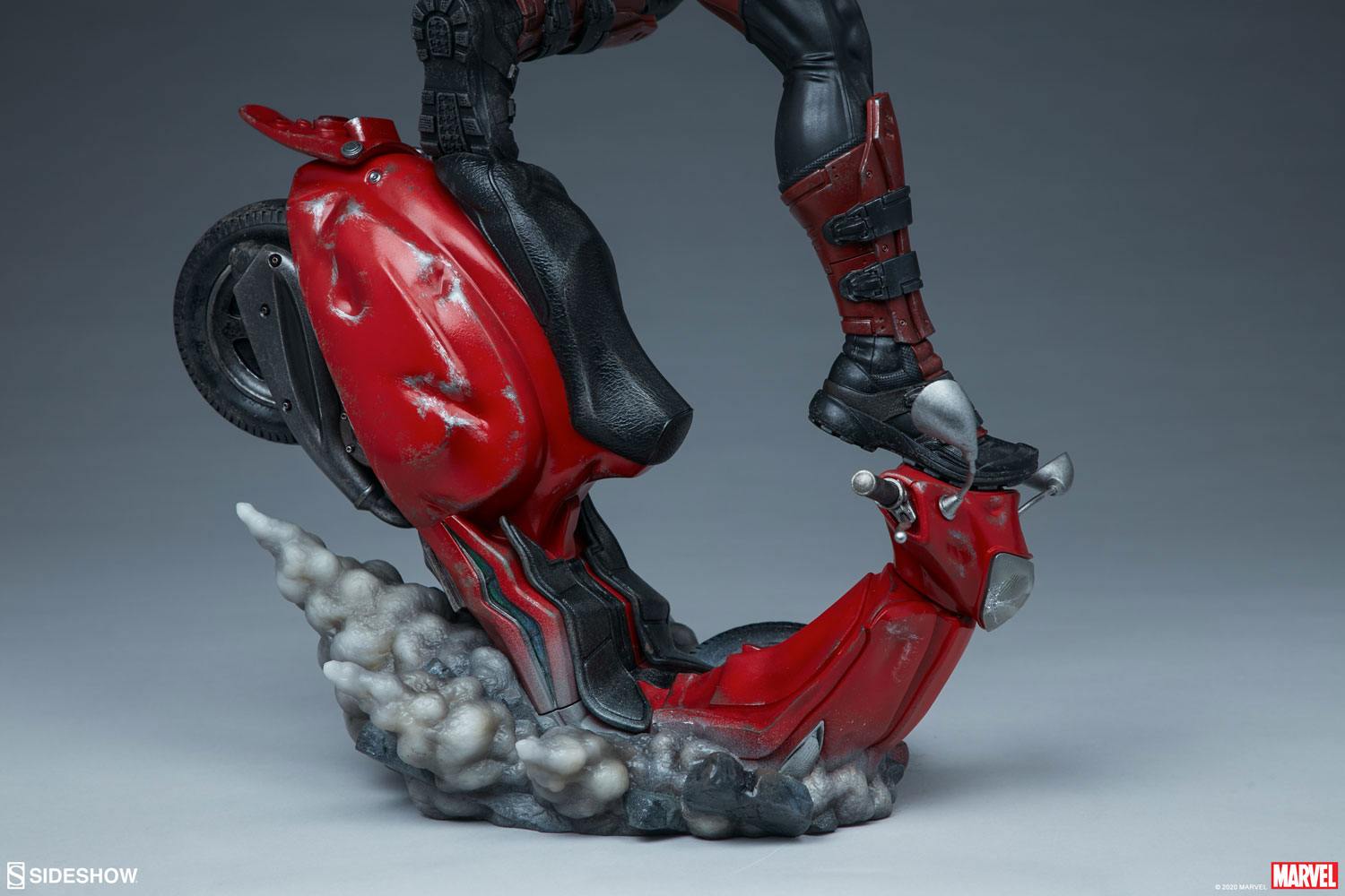 Coming in hot! The Deadpool Premium Format™ Figure measures 20.5" tall as Wade Wilson makes his epic entrance on a crashing red scooter, kicking up a cloud of smoke behind him. Deadpool comes brandishing his signature katanas, but also includes a pair of swap-out hands with fistfuls-o-utensils, just in case the Merc with a Mouth needs to knife, fork with, or even spoon the baddies.